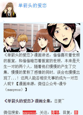 简介:漫画《单箭头的爱恋》简介:偷偷喜欢着世妍的振宣,和偷偷暗恋着振宣的世妍,本来是天生一对的两个人,随着他们慢慢的产生了交集,慢慢的累积了感情的同时,误会也慢慢出现了...!这两人能否相安无事的成为一对恋人呢?